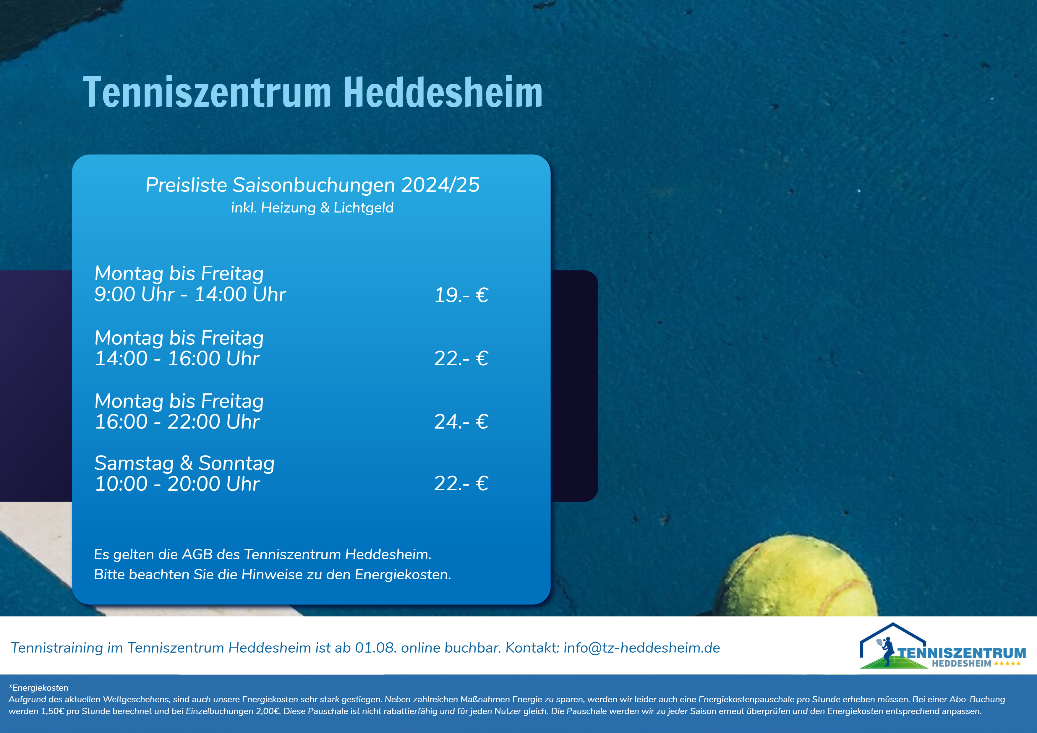 Beim Training in der Tennishalle, fallen zusätzliche Kosten für die Hallennutzung an. Die Kosten für die Hallenmiete werden auf alle Gruppenteilnehmer umgelegt und anteilig berechnet. Die Hallennutzung ist auch in der trainingsfreien Zeit (Ferien) möglich. Es gelten die aktuellen Preislisten des Tenniszentrum Heddesheim und der Tennishalle Lehr, sowie die AGB der Tennisschule Marco Gumbinger.
